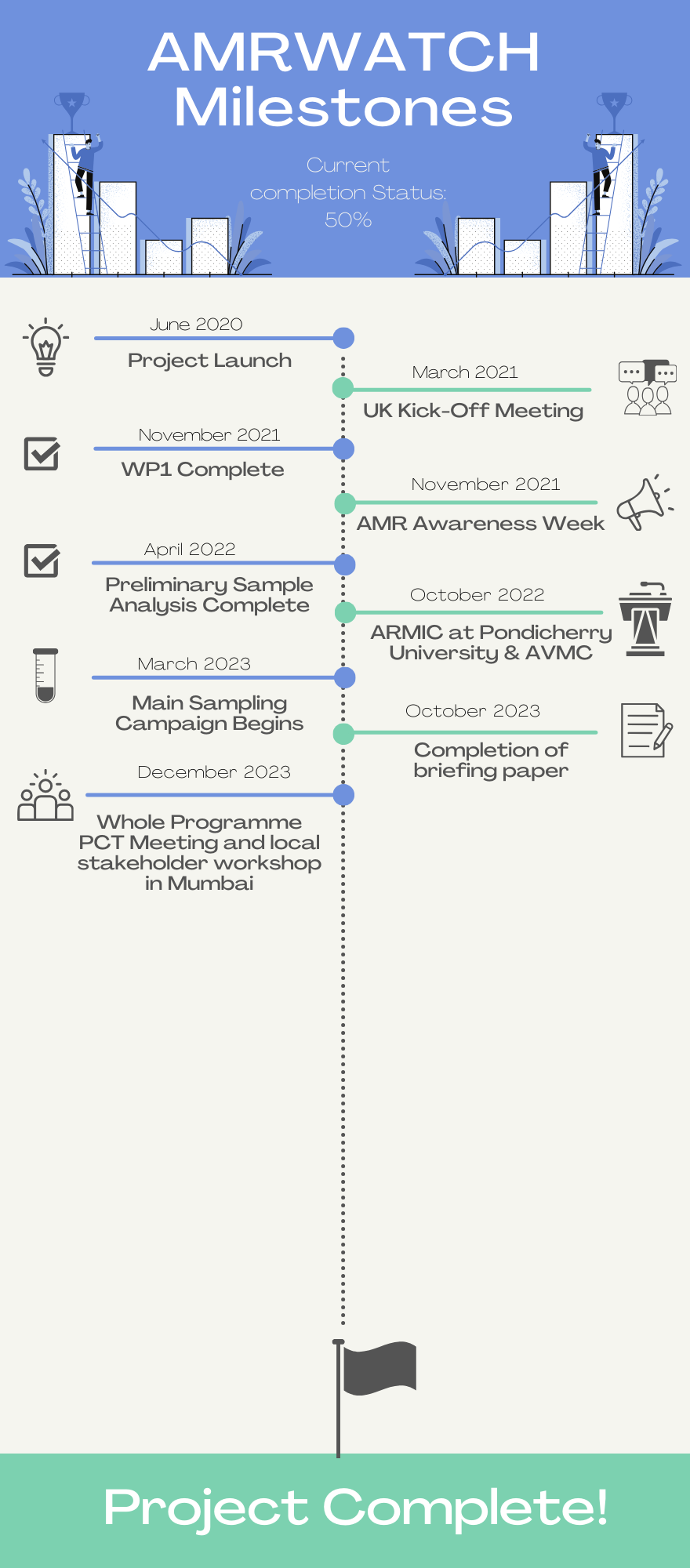 Text description: The title reads 'AMRWATCH Milestones'. The timeline milestones are as follows: June 2020- Project Launch, March 2021- UK Kick-off meeting, November 2021- WP1 Complete, November 2021- AMR Awareness Week, April 2022- Preliminary Sample Analysis complete, October 2022- ARMIC at Pondicherry University & AVMC, March 2023- Main Sampling Campaign Begins, October 2023- Completion of briefing paper, December 2023- Whole Programme PCT Meeting and local stakeholder workshop in Mumbai.