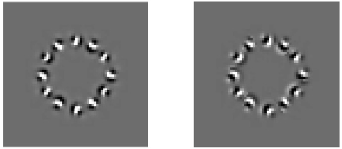 Figure 4. Adapted responses using the fixed weight sets illustrated in Figure 2; left, symmetric and right, antisymmetric. There are more oreintations of kernel present in this image than in the orinal limited set of 4 directions. The input image consists of a set of 12 impulses spaced around the perimeter of a circle.