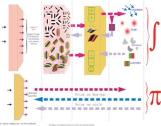 Figure 3. A representation of the main pipeline of the original GVP that was developed in 2008. The convolutional layers, non-linearities and recurrent connections are clearly visible. Later versions used many more layers. Note the layer pairs: red and green linear convolutional units. Note shown: we can also combine information from later layers back to earlier layers (not backprop, but at run-time). Note that the term “orientation adapted” is slightly misleading: whilst we initially used these recurrent connections to generate synthetic convolutional units with rotated weight patterns, we found that we could also synthesize a broad set of effective weight patterns through adaptation.