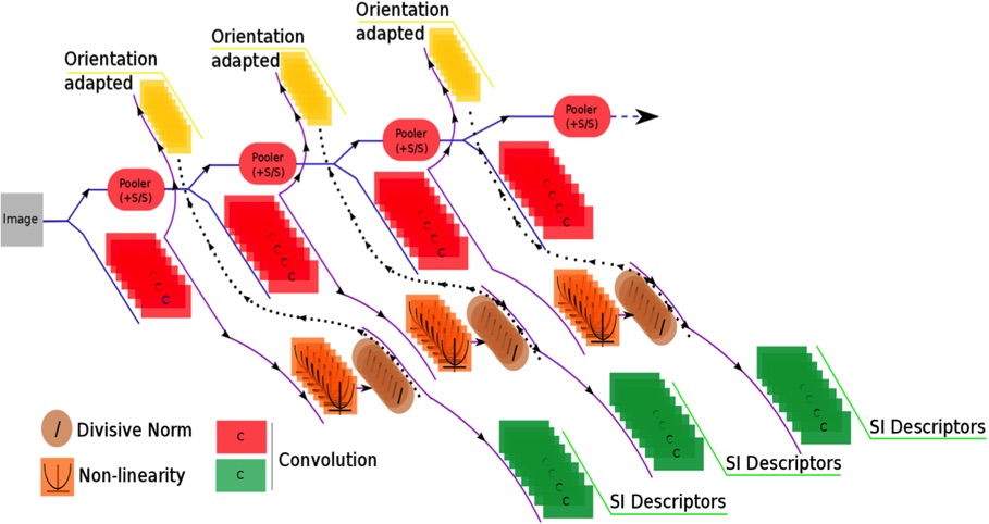 Our original architecture for the GVP was developed between 2007 and 2008. In its initial form, it was not quite as deep as that of AlexNet and systems such as Inception. The depth of training very deep networks hinges on the availability of “Big Data”. Big Data (for the usual purposes of training convolutional networks) means having not only many images, but also accurate labels if you are to train using standard back-prop. Large sets of labelled image data were not available to us at that time (with the exception of trivial data sets such as hand-writing and small images, such as CIFAR 10). We therefore fell back on signal processing and biology to come up with the structure of the network and the non-linear operation of divisive normalisation used between each pair of layers shown in Figure 3.