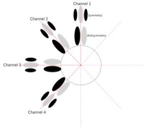 One group of weights may be grouped into 8 channels of orientation, two classes of symmetry and a variety of spatial scales. This diagram shows only 4 pairs of weights belonging to 4 channels; another 4 pairs are present, completing the circular arrangement; we don’t show them because their explicit covolution with the image is redundant.