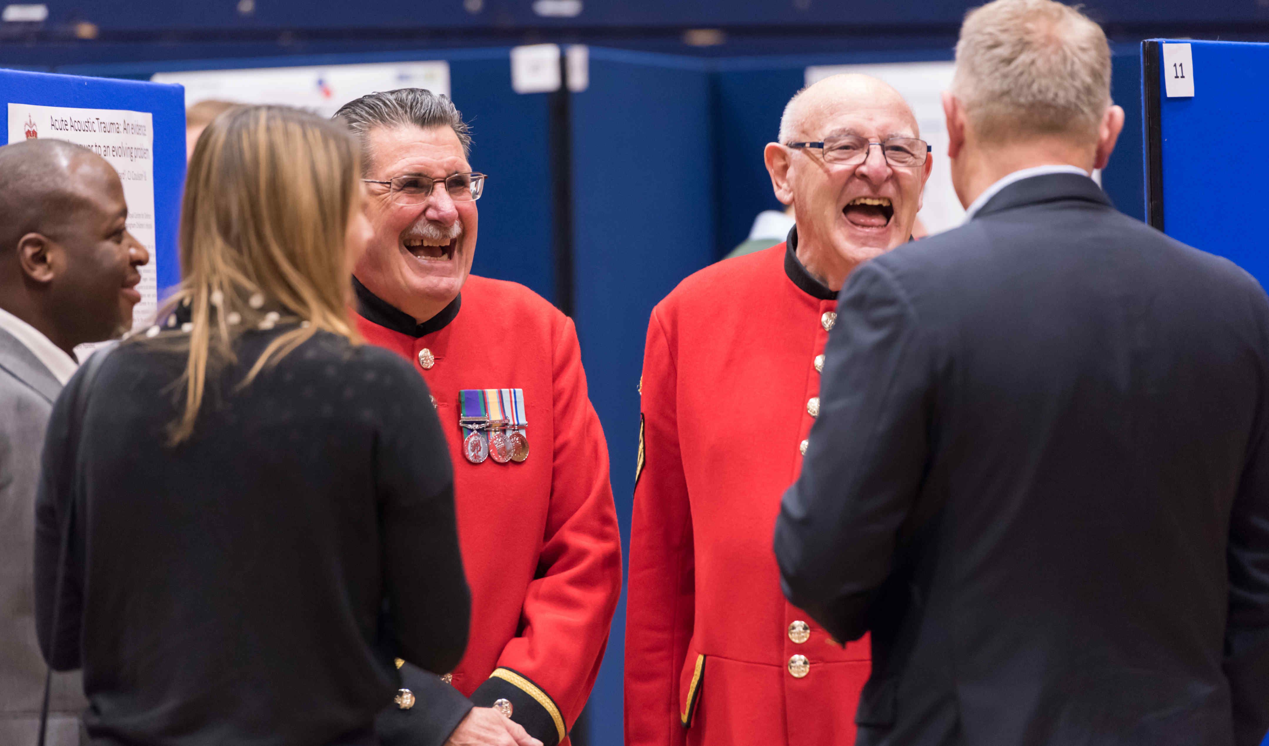 Two Chelsea Pensioners partaking in the morning networking session, ahead of the introduction provided by Professor Anthony Bull.