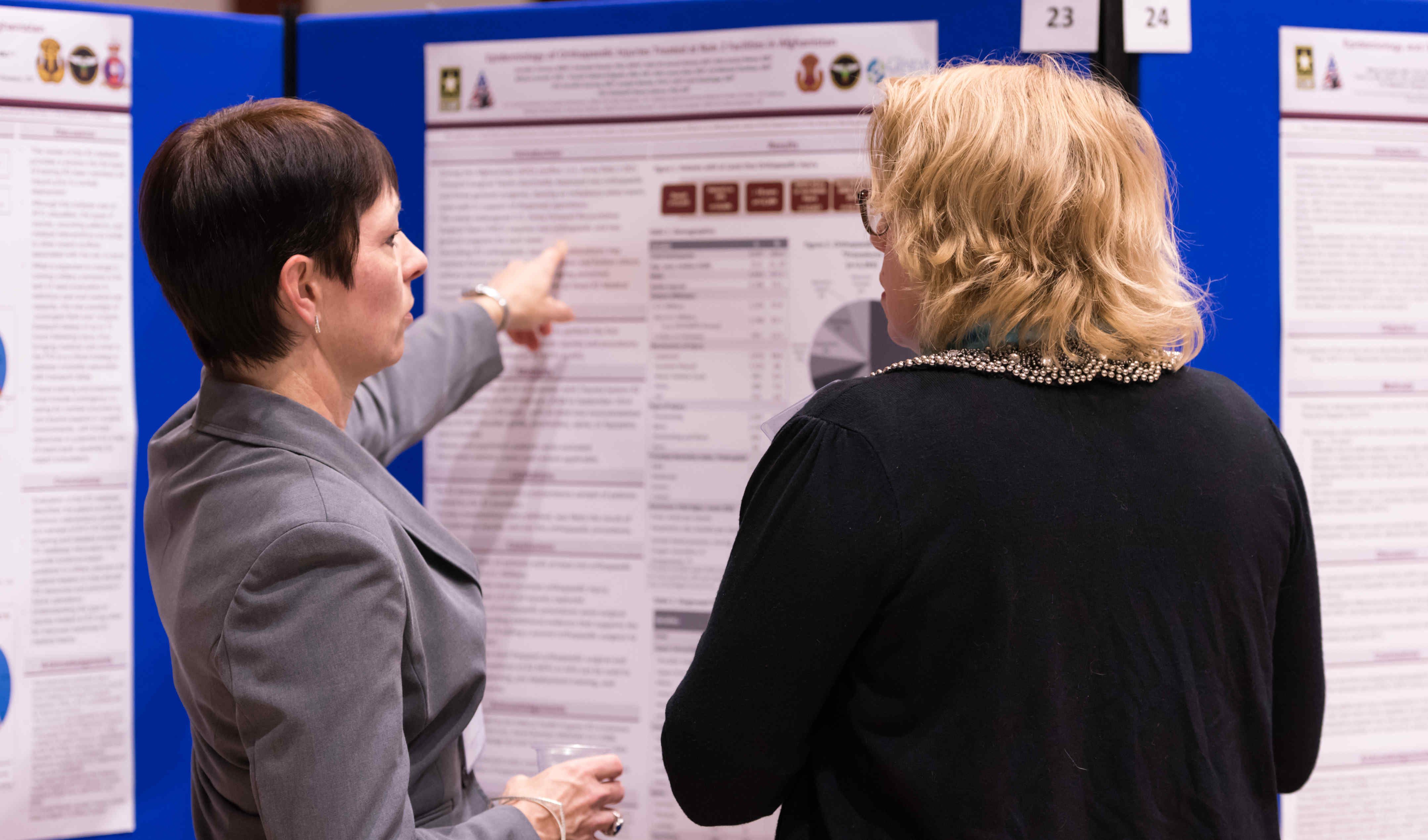 MG Barbara Holcomb and COL (Ret.) Elizabeth Mann-Salinas discussing a poster during one of the breaks.