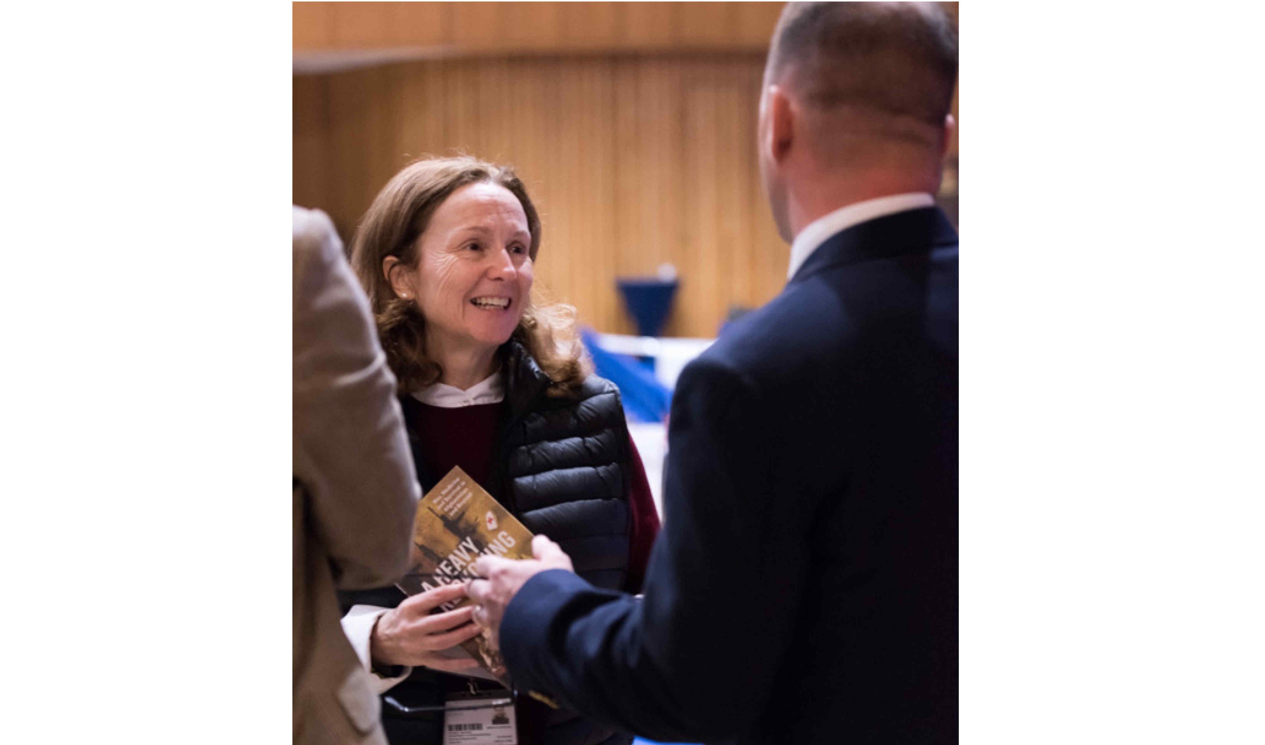 Emily Mayhew holding her book, A Heavy Reckoning, whilst networking with delegates.