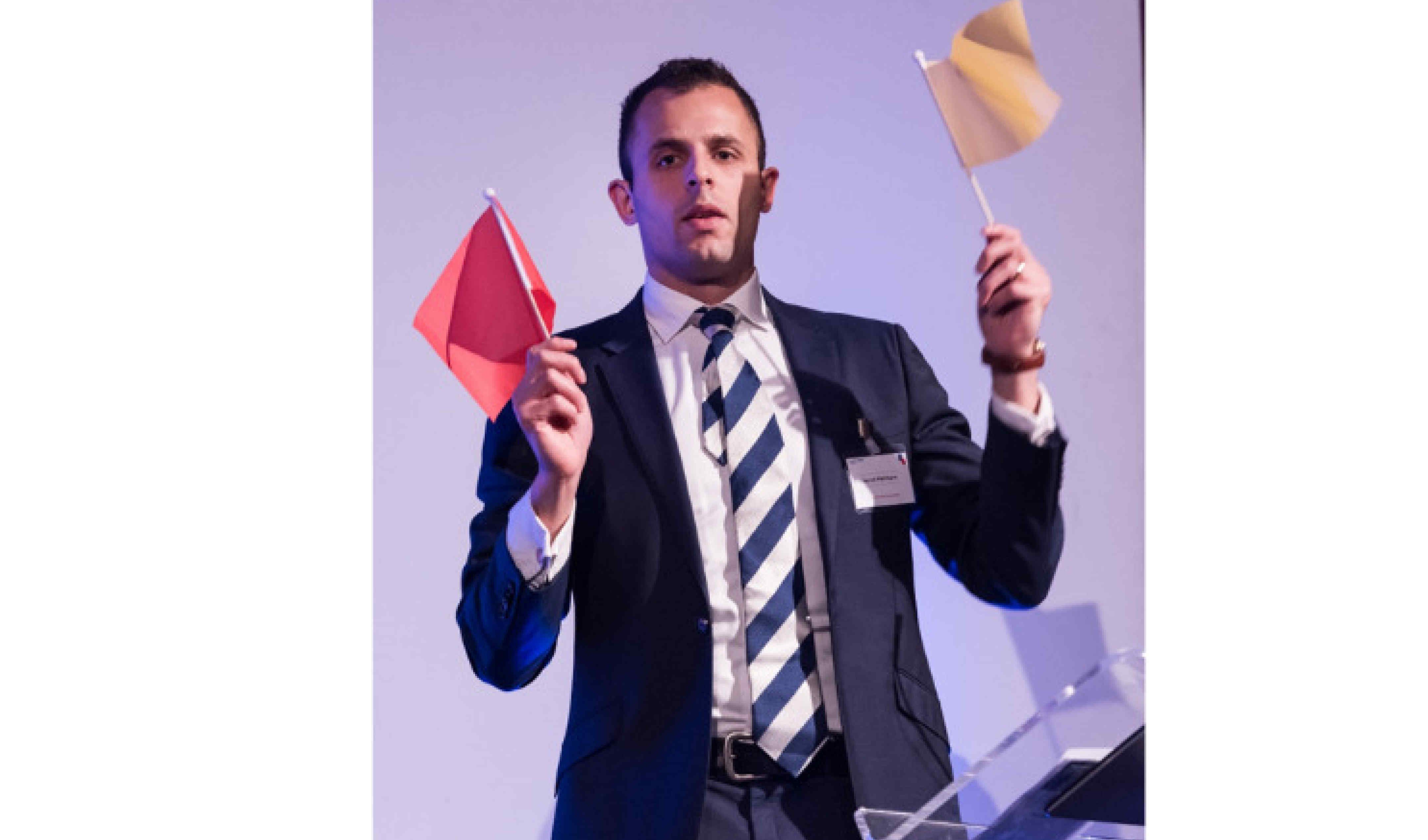 Sqn Ldr Phill Pearce demonstrating how the colour-coded flags should be used to keep presenters to time.
