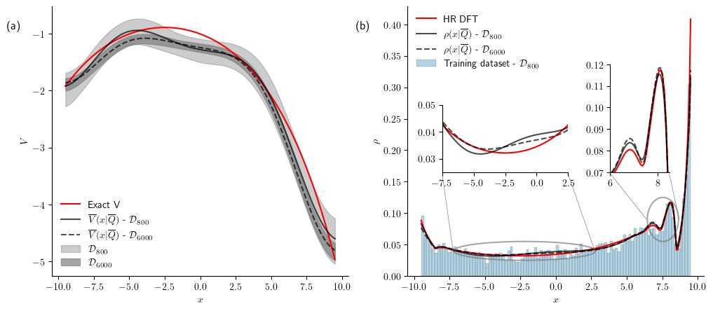 Illustration of the external potential inference for two different datasets, D800 (800 particle configurations) and D6000 (6,000 particle configurations). Left: Comparison between the predicted external potential distribution and the exact external potential (red line). The grey areas encloses the [1st, 99th] percentiles of the predictive distribution. Right: Representation of the exact density profile obtained from DFT of the grand-canonical one-dimensional ensemble (red line), the predicted mean density profile distributions for D800 (black solid line) and D6000 (black dash line) and the histogram of D800 used to infer the external potential.