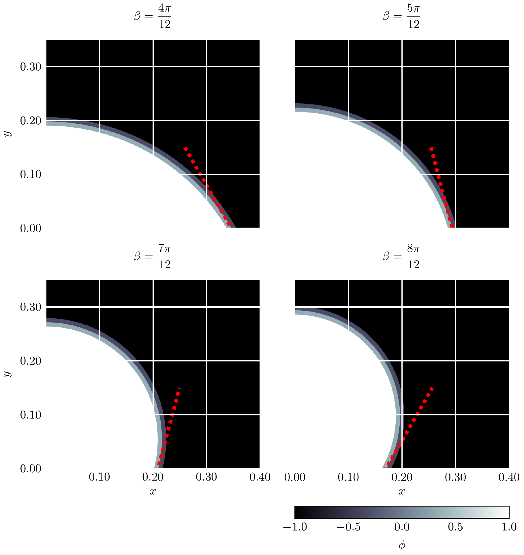 Numerical experiment of wetting phenomena with sessile droplets on a flat solid substrate. In this application a fluid-fluid interface moves along the solid substrate, while a contact line is formed at the intersection between the interface and the substrate. The figure represents the contour plots of stationary states of droplets on a substrate for differente contact angles (β) between the droplet and substrate. φ is the phase-field function, which describes the phase of the system with the limiting values φ = 1 and φ = -1 representing the two phases. The theoretical contact angles are shown by the dashed red lines, demonstrating good agreement with the simulated scheme.