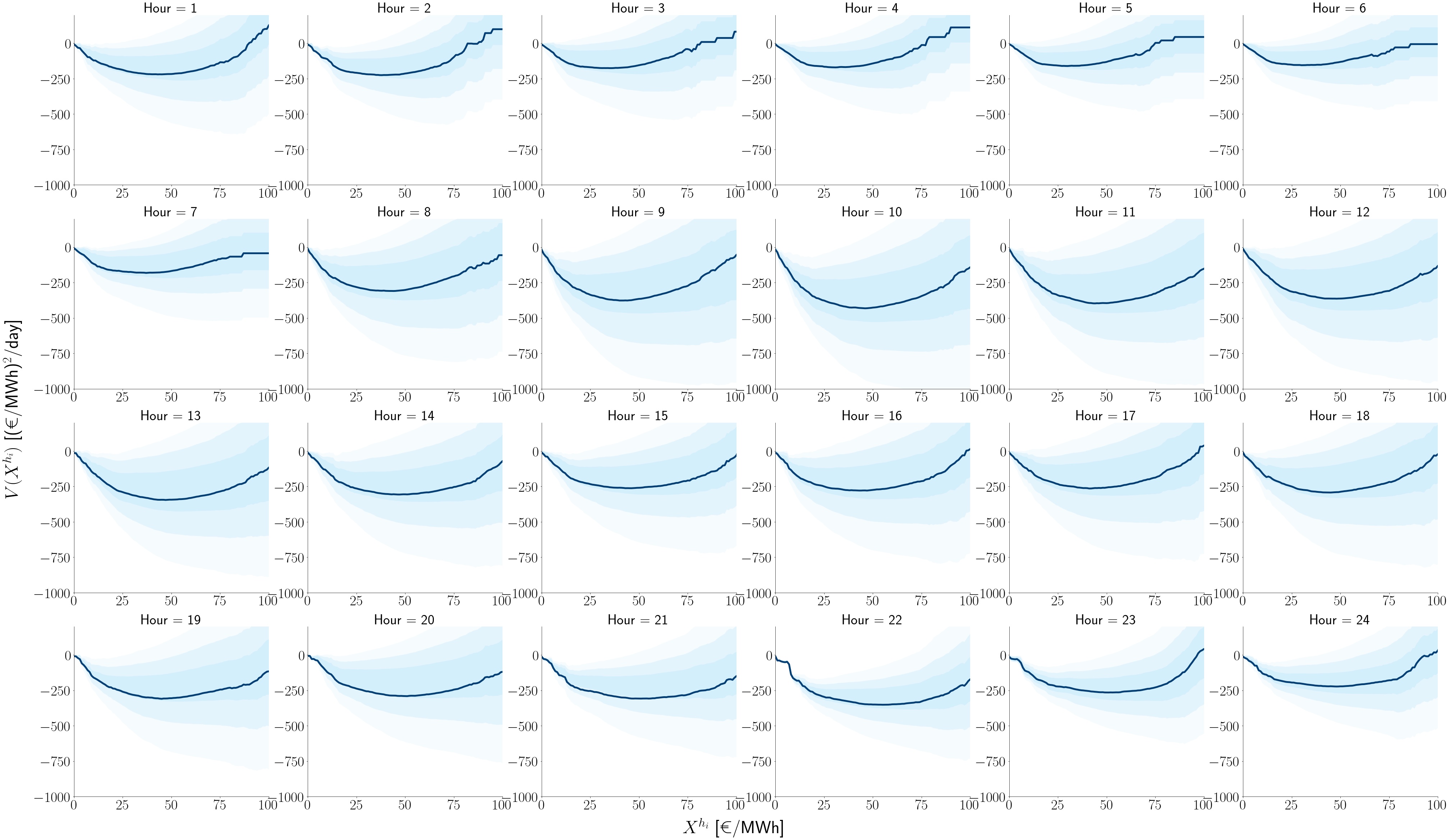 Particle model for the electricity day-ahead price: potential function of each hour obtained from the drift term. Dark-blue lines represent the expected potential. Each hour exhibit different different equilibrium values (minimum of the parabola) and distinct mean-reverting intensity values. These dynamics are reminiscent of a particle fluctuating in a harmonic potential.