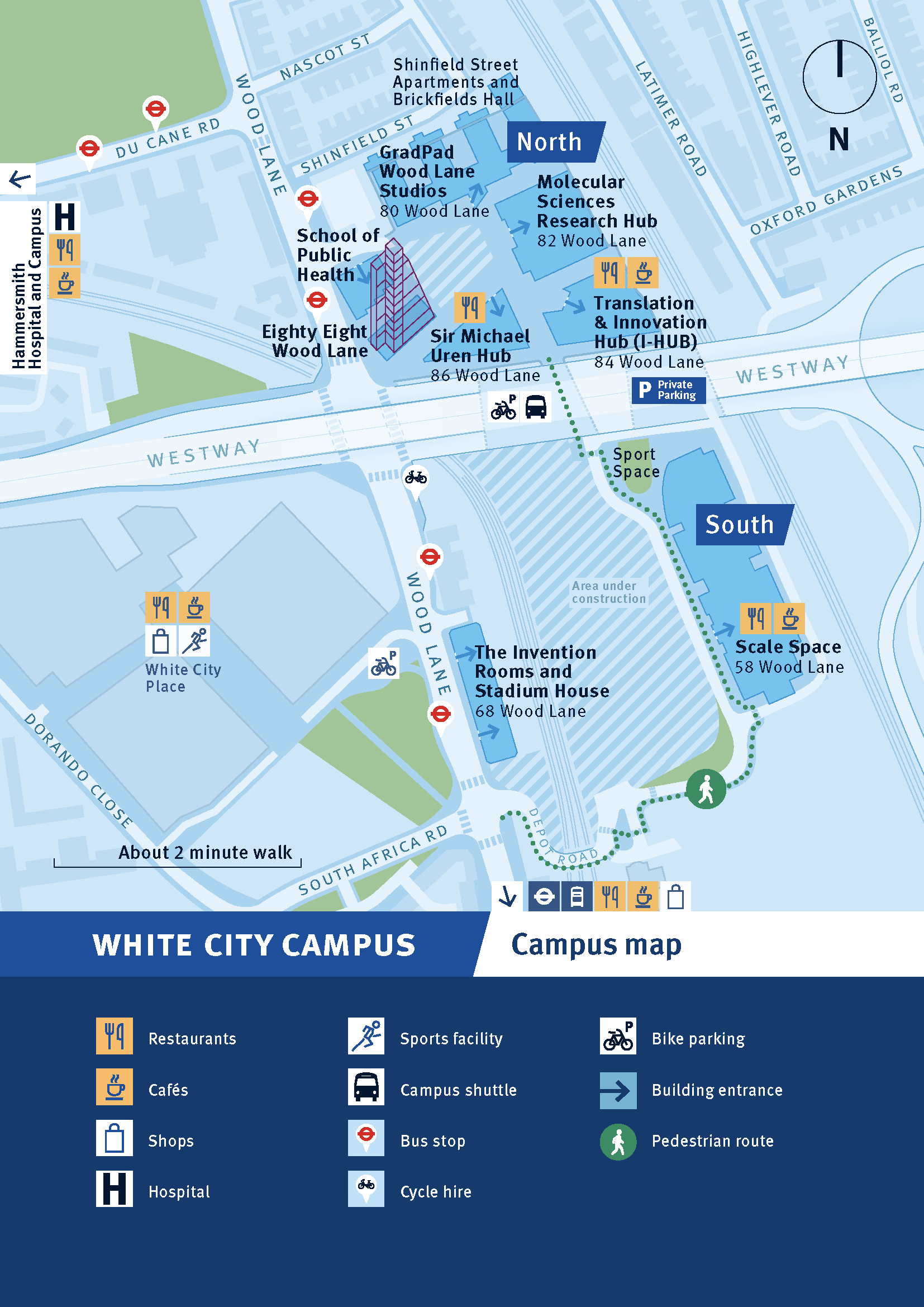 - White City, situated in zone two on the central line, is the closest underground station to the White City Campus. It is approximately a 5 minute walk from the campus. Alternatively you can walk for three minutes to bus stop WE on Wood Lane, where you can take buses 72, 272, and 220 to Cavell House (Stop P) and cross the road to enter the White City Campus.