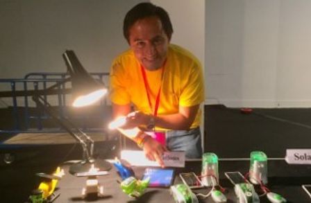 Scot helping the visitor to shine the light on a solar insect to make it moves