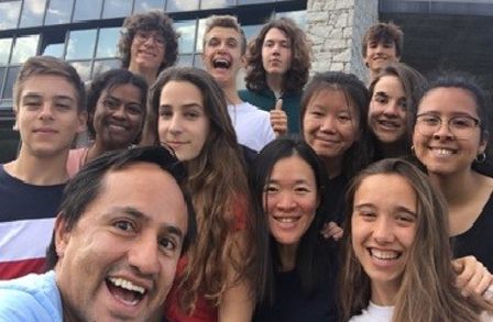 Camilo, Shababa and Yuhan making the most of a selfie opportunity with the students