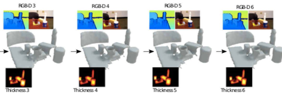 Detailed 3D reconstruction is an important challenge with application to robotics, augmented and virtual re- ality, which has seen impressive progress throughout the past years. Advancements were driven by the availabil- ity of depth cameras (RGB-D), as well as increased com- pute power, e.g. in the form of GPUs – but also thanks to inclusion of machine learning in the process. Here, we propose X-Section, an RGB-D 3D reconstruction approach that leverages deep learning to make object-level predic- tions about thicknesses that can be readily integrated into a volumetric multi-view fusion process, where we propose an extension to the popular KinectFusion approach. In essence, our method allows to complete shapes in general indoor scenes behind what is sensed by the RGB-D cam- era, which may be crucial e.g. for robotic manipulation tasks or efficient scene exploration. Predicting object thick- nesses rather than volumes allows us to work with compa- rably high spatial resolution without exploding memory and training data requirements on the employed Convolutional Neural Networks. In a series of qualitative and quantitative evaluations, we demonstrate how we accurately predict ob- ject thickness and reconstruct general 3D scenes containing multiple objects.