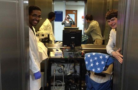 Setting up the experiment: Franky, Isaac, Anna, pram + baby, reactor and potentiostat