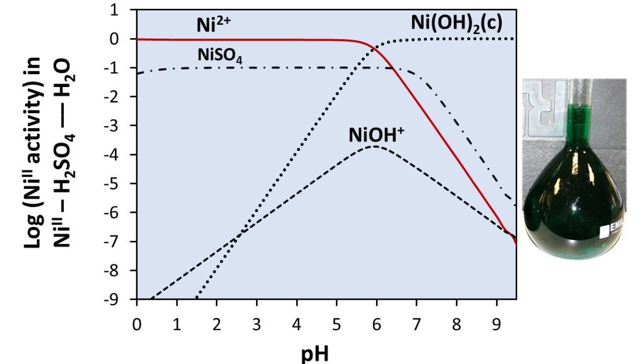 We believe it is unlikely that Ni(II) electrodeposition proceeds via the Ni(OH)ads intermediate, due to the negligible concentration of NiOH+ relative to uncolplexed Ni2+ (aqueous speciation shown on the right). We postulate that the reduction proceeds via the Ni+ads intermediate, which competes for electrode surface area with adsorbed hydrogen atoms.