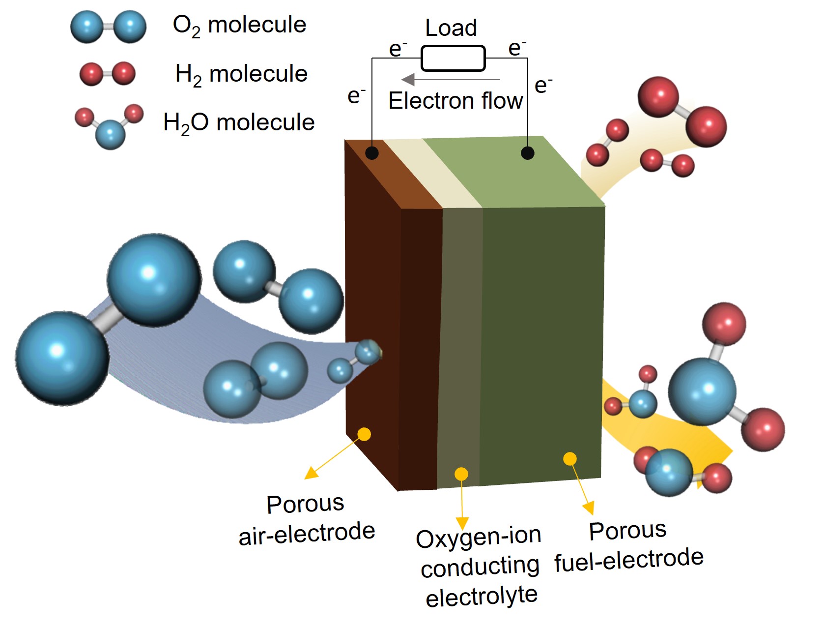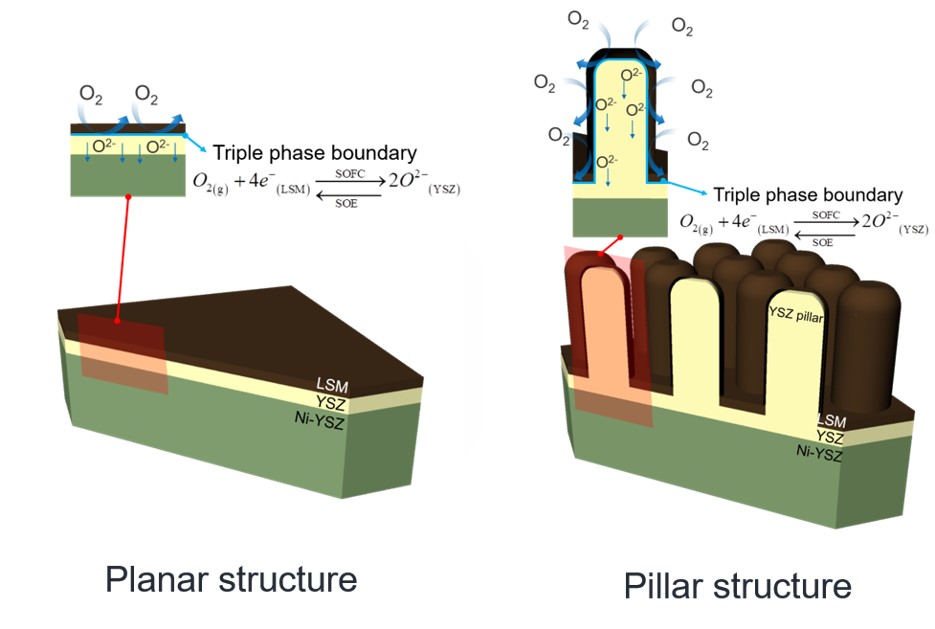 We fabricated 3-D structured electrodes or electrolyte layers for high-performance SOERs for clean and efficient power generation and CO2 electrolysis and H2 production. For the development of high-performance SOERs, it is crucial to boost the rates at which geseous species react on each electrode. The reactions occur at the interface between electronic conductors | ionic conductors | pores in the porous electrode; such interfaces are known as 'triple-phase boundaries' (TPBs). Hence, densities of such TPBs determine the reaction rate of gaseous species, reacting with the electrons and ions flowing-in or out through electronically-conducting electrodes and ionically-conducting electrolyte phases. Therefore, increasing TPB densities facilitate the conversion of the gases in the electrodes, leading to the enhanced SOER performance. Our goal is increasing these TPB densities through constructing 3-D structured electrodes or electrolyte layers to ultimately increase the performance of SOERs. The performance of 3-D structured electrodes was compared with planar structures, to elucidate geometric effects on reactor performance (Figure 2).