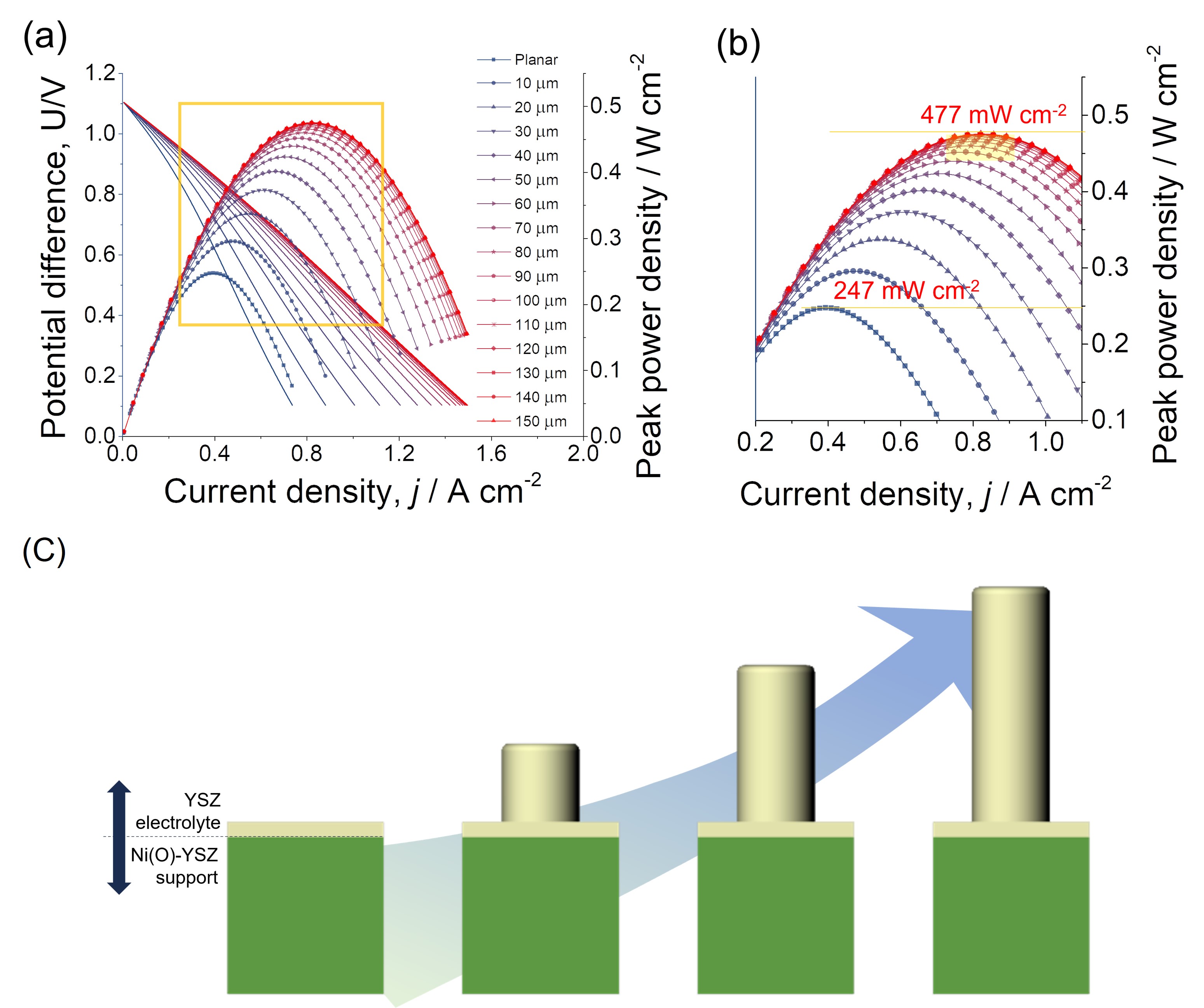 First, we predicted the optimal geometry of the 3-D structured pillars through computational modelling (COMSOL Multiphysics), by designing the SOERs cell with various YSZ pillar heights from 10 µm to 150 µm. Figure 3 shows calculated SOERs performance in fuel cell mode at each pillar height value, demonstrating the performance saturation from 90 µm pillar height. Subsequently, based on the predicted optimal pillar geometry, we moved on to the fabrication of micropillar structures for SOERs to validate our computational prediction.