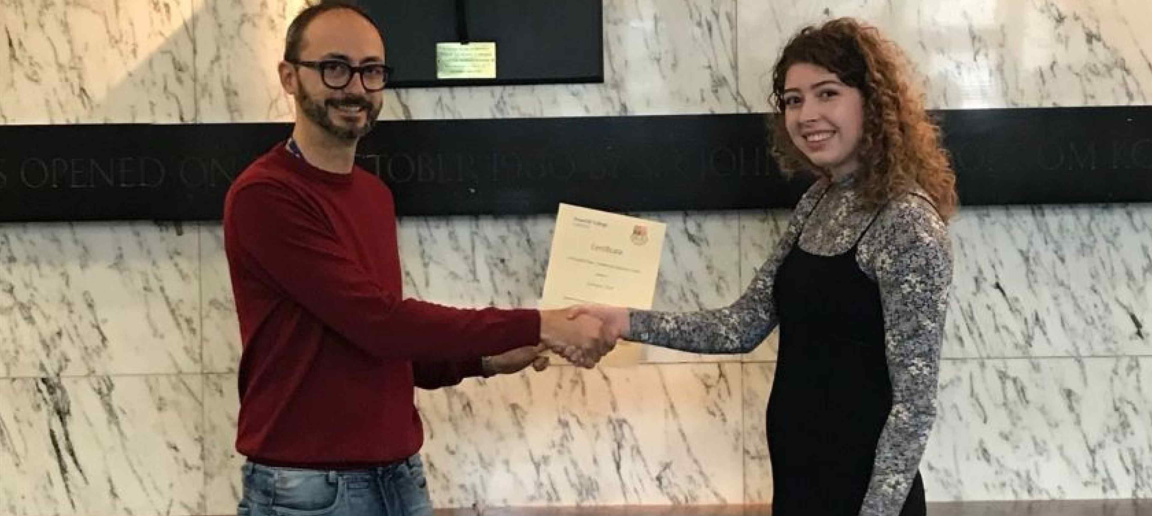 Riccardo Sapienza congratulates Georgia Foot with the UROP project "The optimisation of hybrid semi-transparent solar cells"