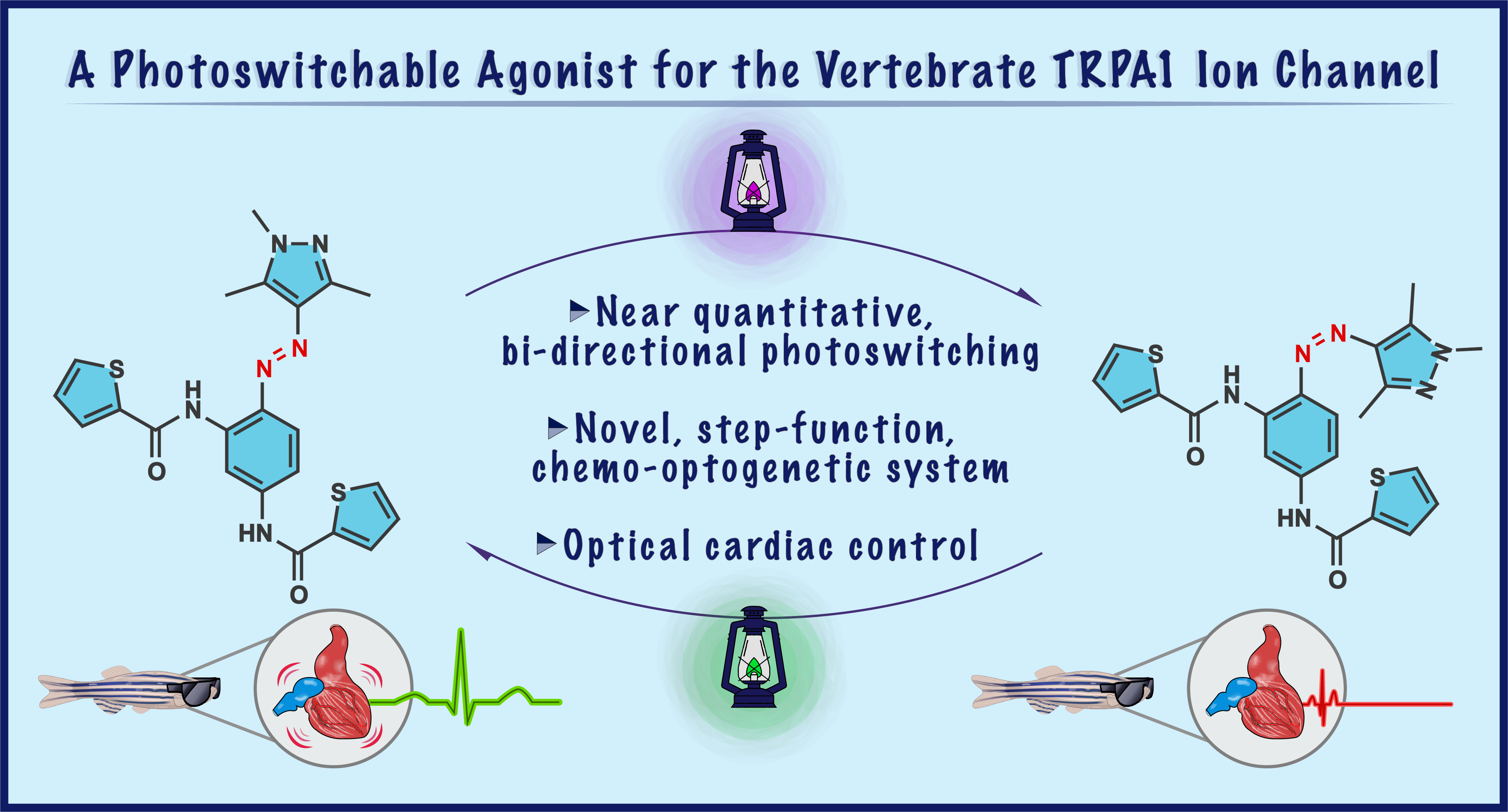 This latter study was particularly exciting as it allowed us to demonstrate photocontrol of physiology in live zebrafish larvae, using our heteroaromatic switches. The TRPA1/TRPswitch combination has a number of key advantages over other chemo-optogenetic approaches and should be particularly applicable in systems where a large depolarization current is needed or sustained channel activation is desirable. Representative publications: Chem. Commun. 2022, 58, 10933. DOI; J. Am. Chem. Soc. 2020, 142, 17457. DOI; J. Med. Chem. 2020, 63, 11436. DOI; ACS Infect. Dis. 2017, 3, 152. DOI.