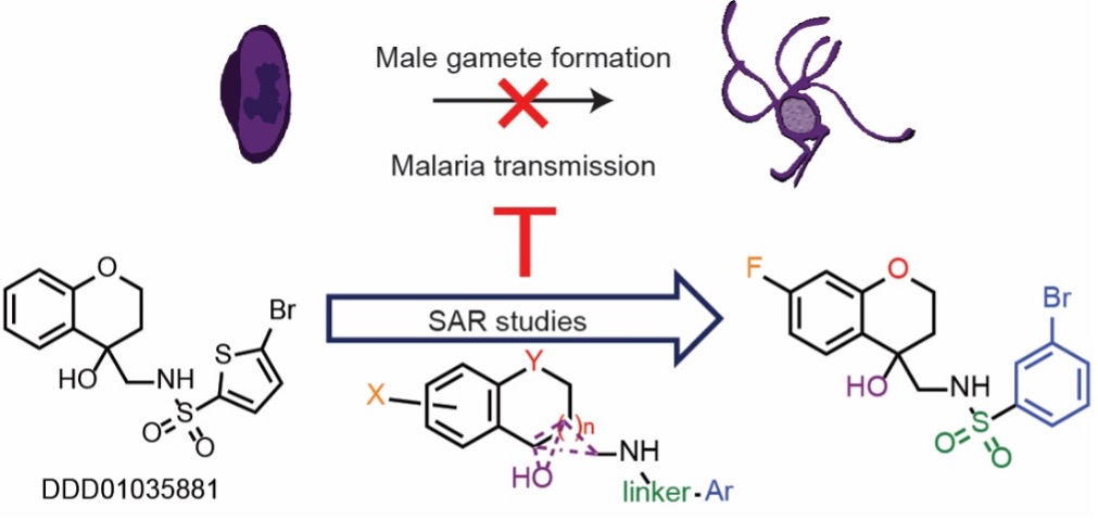 As a representative example, in collaboration with Professor Jake Baum, we have been pursuing unique transmission-blocking anti-malarial compounds. In malaria management, there is an increasing interest in the discovery of novel drugs that target parasite passage from the infected individual to the feeding mosquito and back again. The action of such therapeutics is geared at the population level and could result in the eventual eradication of malaria. Following an in-house high throughput screen, DDD881 was identified as an exciting new hit compound that appeared to block parasite transmission by specifically targeting the transformation of the sexual stages of Plasmodium progression. We have conducted further hit to lead medicinal chemistry on DDD881 and identified Plasmodium falciparum 16 kDa parasitophorous vacuole membrane (PVM) protein Pfs16 as the target of this compound. Representative publications: Dis. Model Mech. 2023, 16, dmm049950. DOI; J. Med. Chem. 2020, 63, 2240. DOI; Curr. Opin. Chem. Biol. 2019, 50, 1. DOI; Nature Commun. 2018, 9, 3805. DOI