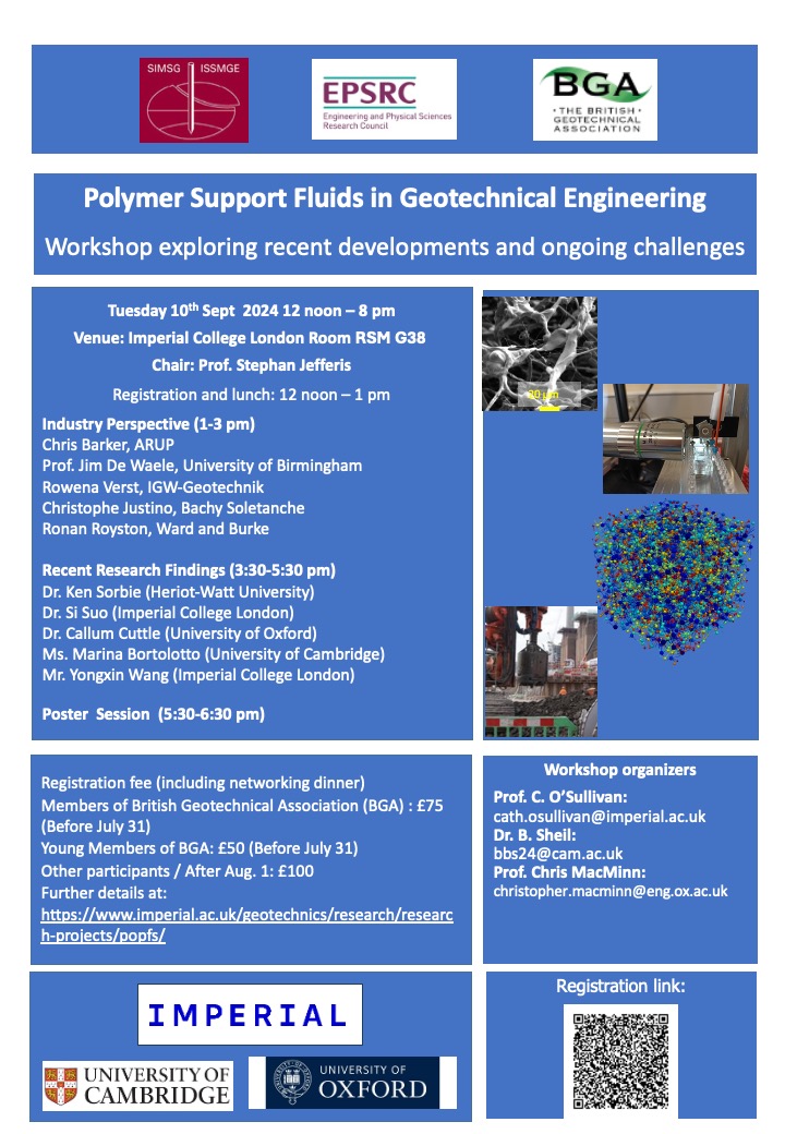 We are delighted to announce our industry engagement workshop to explore recent developments and ongoing challenges in the use of polymer support fluids. This will take place on Tuesday 10th Sept 2024 (12 noon – 8 pm) in Imperial College London Room RSM G38. The workshop will be chaired by Prof. Stephan Jefferis. Speakers include Chris Barker (ARUP), Prof. Jim De Waele(University of Birmingham), Rowena Verst (IGW-Geotechnik), Christophe Justino (Bachy Soletanche), and Ronan Royston(Ward and Burke). Our research team will also update on our recent progress and future plans. Our registration link is here. Direct inquiries to Catherine O'Sullivan