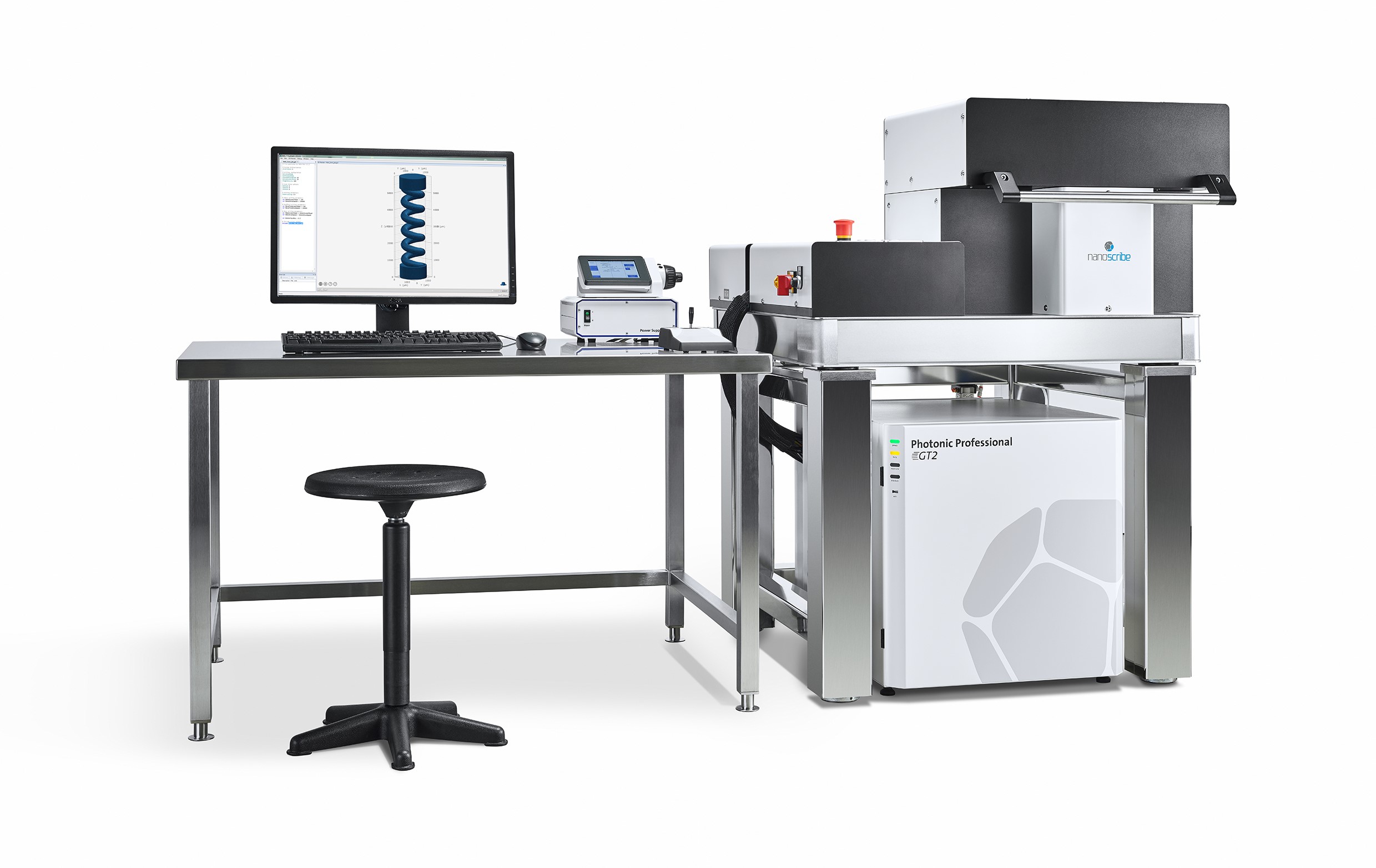 The Photonic Professional GT is a compact laser lithography system enabling true 3D micro- and nanofabrication via two photon polymerisation. It combines two writing modes in one device: An ultra-precise piezo-mode for arbitrary 3D trajectories and the highspeed galvo-mode for fastest structuring in a layer-by-layer process.