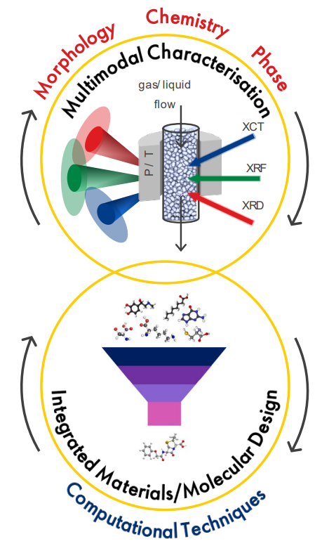 The rapid and safe deployment of carbon capture (utilisation) and storage CC(U)S is essential to meeting our climate targets. Central to these technologies is an understanding of two-phase flow in porous materials, and of the transport processes within their pores. For InFUSE, this includes studies of the functionality of microporous adsorbents in their operating environment (by probing the concentrations of chemical species in both the fluid and the solid), the formation of carbonate minerals within rock pores and their impact on reservoir quality, and wettability design for optimal flow performance within porous systems. Recent achievements in synchrotron-based experimentation at Diamond provide unprecedented opportunities for quasi-simultaneous acquisition of x-ray tomograms and diffraction patterns. Microscale studies within the same sample at the same location opens up new opportunities in the combined observation of phase and morphology during these processes.