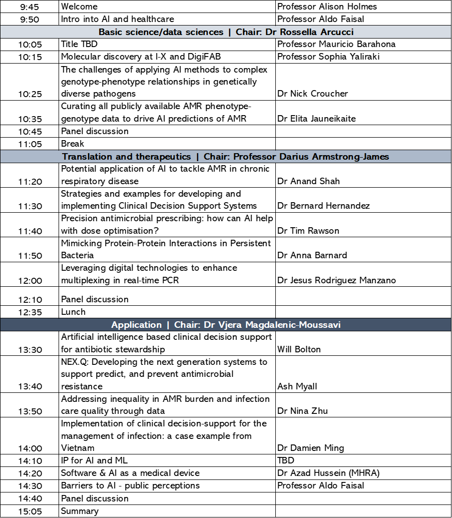 This event, held on 9th February, 2024, was co-organised by Imperial’s Institute of Infection, Artificial Intelligence Network, NIHR HPRU in Healthcare Associated Infections and Antimicrobial Resistance, Centre for Antimicrobial Optimisation (CAMO), and Artificial Intelligence Network.