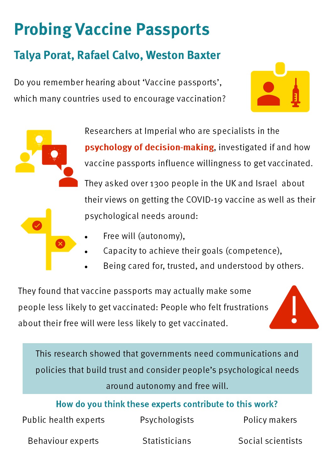 - Porat et al., “Vaccine Passports” May Backfire: Findings from a Cross-Sectional Study in the UK and Israel on Willingness to Get Vaccinated against COVID-19. Vaccines (2021) 9, 902.