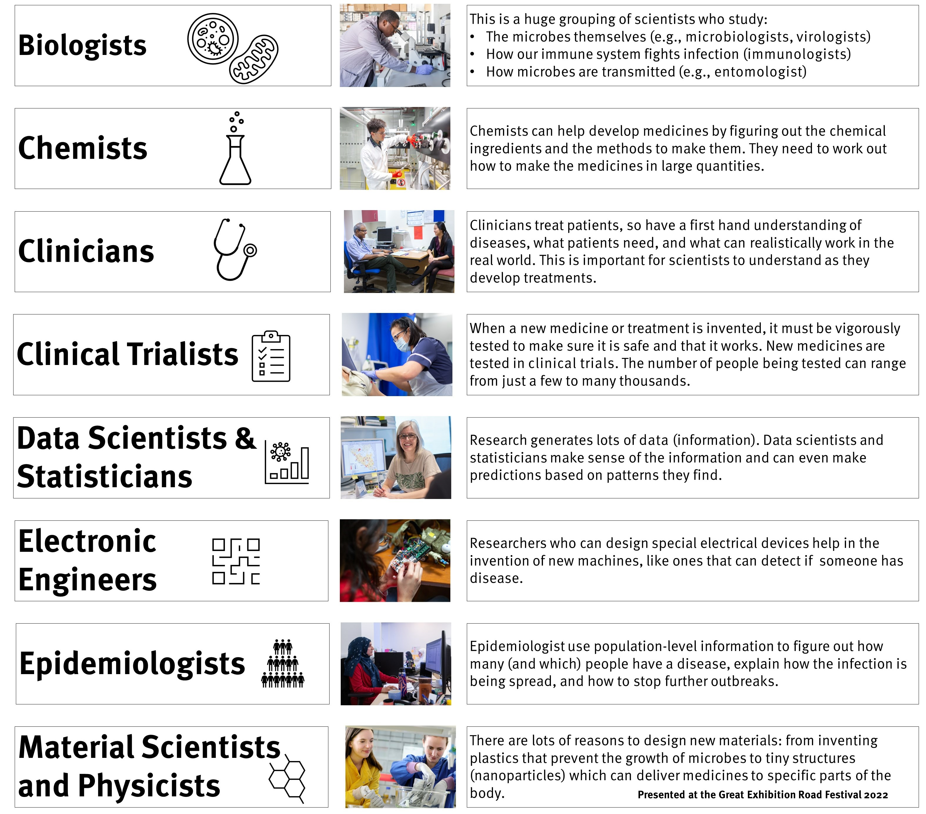 It takes an army of scientists with a huge range of expertise to understand infection and find ways to treat and prevent disease. This poster - presented at the Institute of Infection's stand at the Great Exhibition Road Festival 2022 - shows just some of the kinds of scientists who are fighting to keep us healthy.