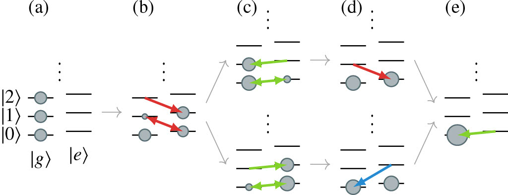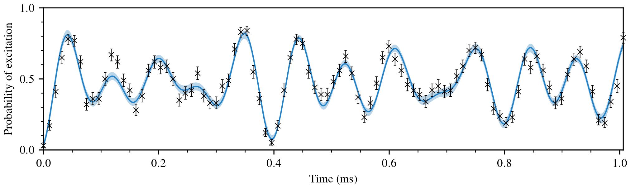 By preparing our ion in this state, we can first observe the Rabi frequency coupling of each motional state by observing the time evolution while driving the blue sideband transition which can be seen in figure 2. The Rabi frequency coupling the |g, 0> to the |e, 1> states (a blue sideband transition) was measured to be 6.94kHz, with with each oscillation frequency for the state |g, n> increasing by a factor of √(n+1)
