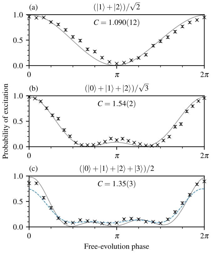 We implement the free-evolution of a state by changing the phase of the sideband pulses applied between the state creation and measurement-mapping sequences. Figure 3 shows the interference pattern for different superposition states, with their certified coherence values given. Plot a shows an initial demonstration of the coherence certifier with the value of 1.090 verifying two-level coherence. We were then able to demonstrate the creation of a triple state and verifying its three-level coherence in plot b, with the certifier exceeding the threhold with a value of 1.54. The final plot shows an attempt at creating a 4 state, which provides evidence that the certifier is unable to provide a false positive.