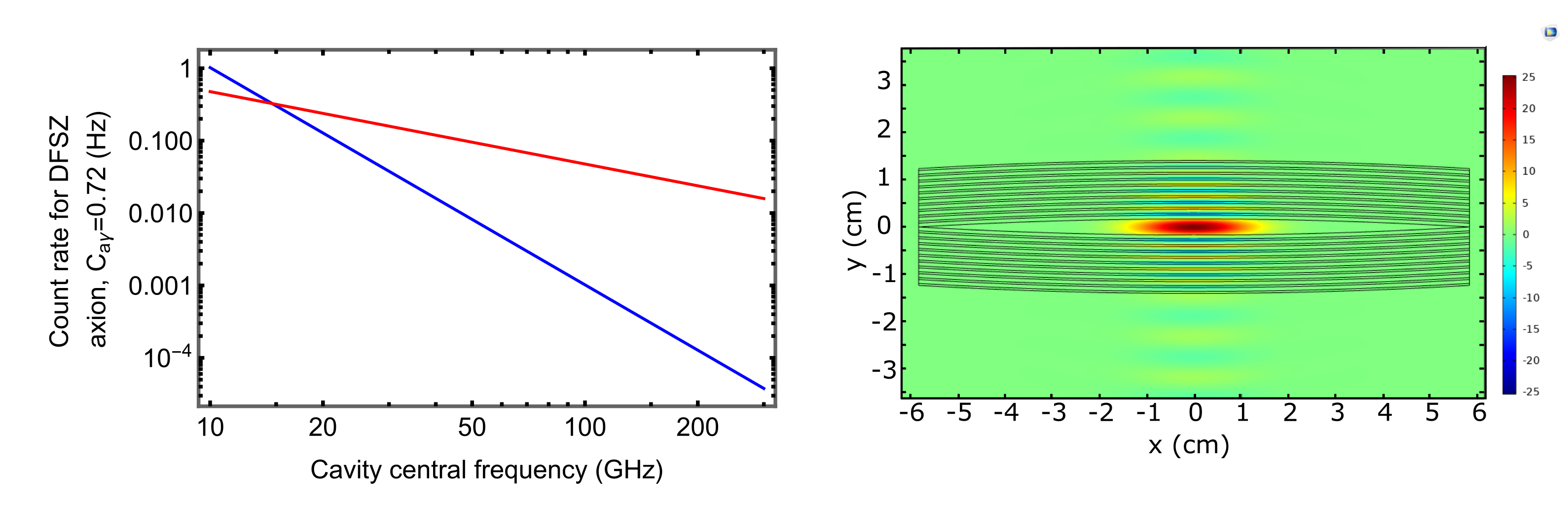 Making a very high-Q Fabry-Perot comes with its own challenges, and we are investigating a variety of technologies including thin superconducting films, high temperature superconductors and Bragg reflectors to manufacture the mirrors. On the right hand side of the figure you can see a COMSOL simulation of the electric field inside a Fabry-Perot cavity made with Bragg mirrors.