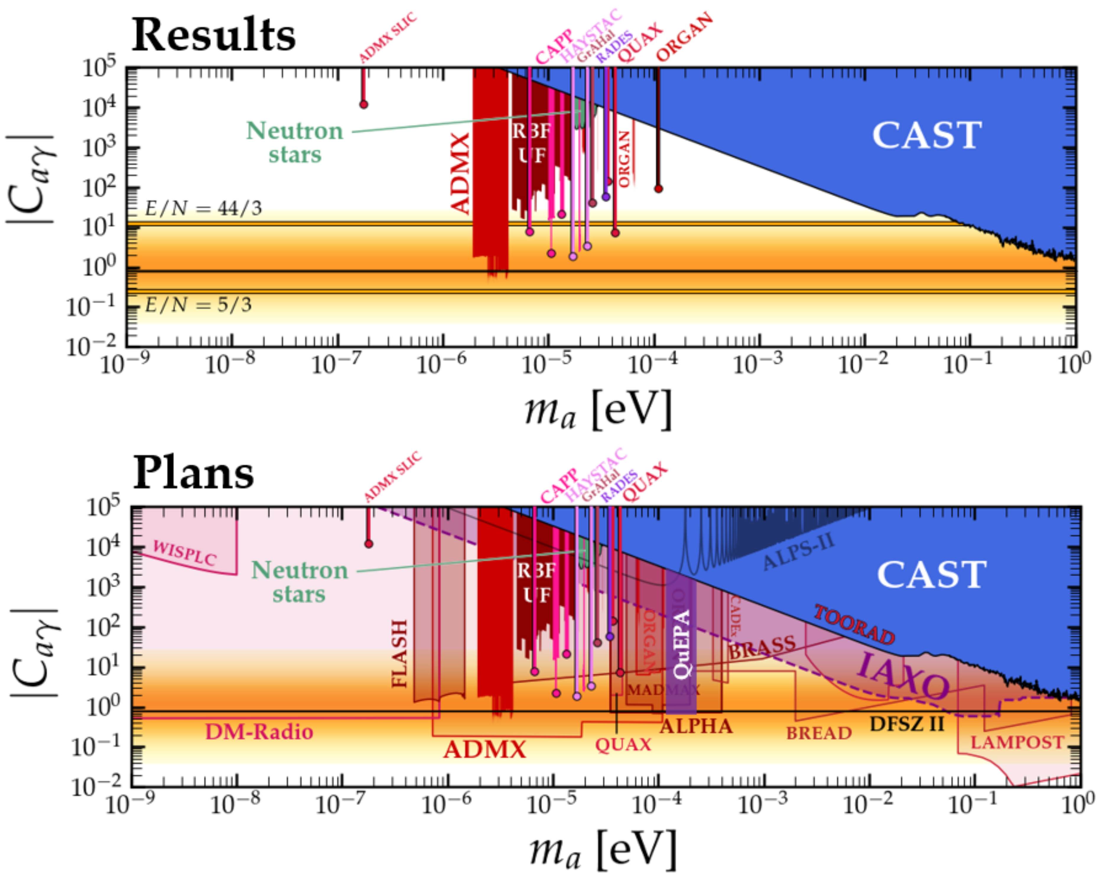The top plot in shows a ploot of the constraints on the coupling between photons and axions for different axion masses ma. The coupling is given in terms of a coupling coefficient CAγ which should be around 1 in most axion models. The bottom plot includes the targets of various experimental efforts, including QuEPA between 120-240 ueV.