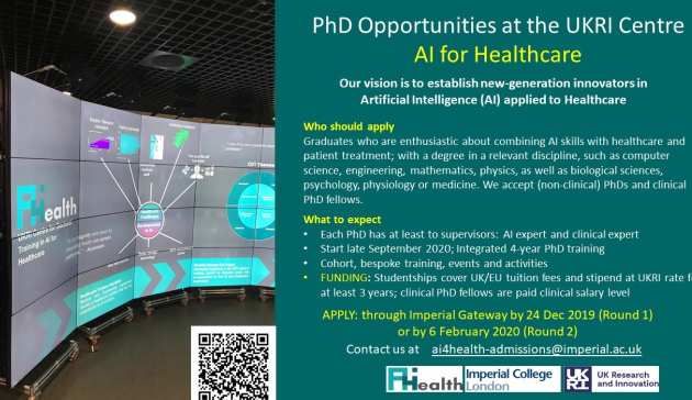 PhD opportunities at the UKRI Centre for Doctoral Training Artificial Intelligence for Healthcare: The UKRI Centre for Doctoral Training in Artificial Intelligence for Healthcare at Imperial focusses on healthcare applications of core AI to train AI PhDs and Clinical PhD Fellows. We will deliver training integrating the development of technical skills with an appreciation for approaches to human-in-the-Loop AI design that are socially and ethically acceptable. The term “AI” means for us the development of intelligent systems that embody a practical solution. Amongst contemporary AI approaches, Machine Learning methods have shown to yield powerful solutions which work in purely data-driven manners and link via data science to emerging biomedical research methodologies. However, practical solutions involving AI will require a broader approach and we will drive technical innovation by providing broad training for exploitation of multiple technological strategies within the broader realm of AI, including, Machine Learning, Logic-based, Computer Vision or Natural Language Processing methods.