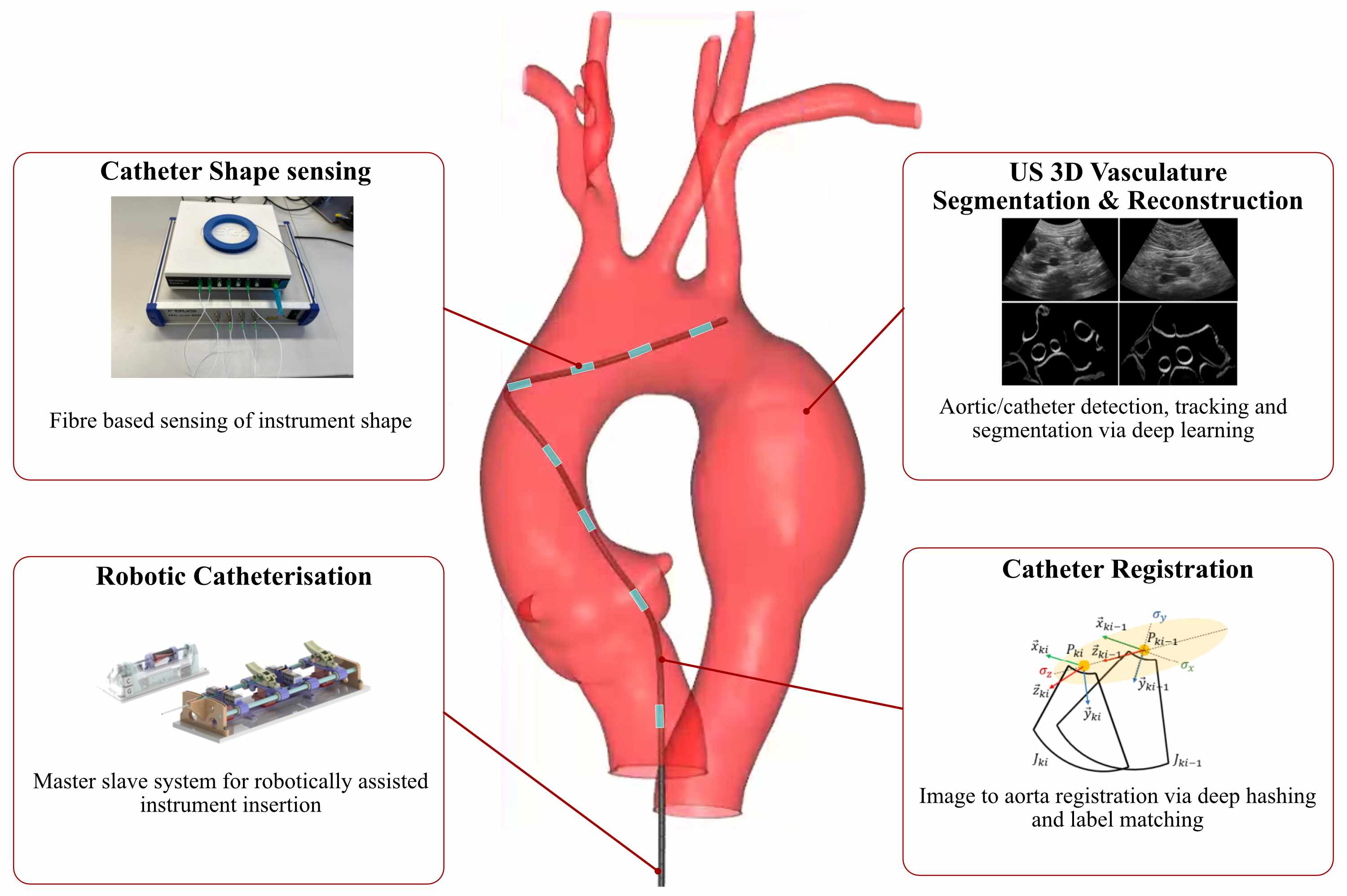 great importance for the NHS and the society at large, as it reduces further medical complications, saves costs, and improves safety. With this in mind, the main goal of this research project is to replace Fluoroscopy with Ultrasound for sur gical guidance, create an intelligent robotic catheterisation system for traversing a torturous vasculature, and an ergonomic visualisation software to facilitate real-time monitoring of the instruments and anatomy.