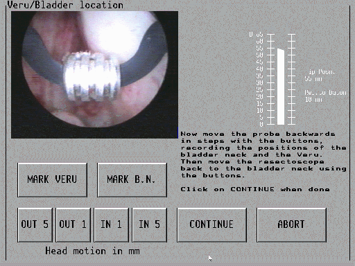 It is important that the length of the prostate is known and that the robot is positioned at the bladder neck. The measurement phase of operation allows the surgeon to move the robot under computer control along the prostate from the bladder neck to a landmark feature - the Verumontanum - to define the region in which cutting will take place. Cuts past the verumontanum may damage the sphincter muscles so these are to be avoided. The surgeon estimates the position in the prostate using visual cues - i.e. his skill in identifying features from a video image from within the prostate. The image below shows the screen the surgeon sees while measuring the prostate. In the top left is a real time camera image from within the prostate. To the right is a gauge indicating the position of the resectoscope tip, while underneath are a set of control buttons and simple instructions for the surgeon. The controls are activated by touching a light pen to the screen over the appropriate button.