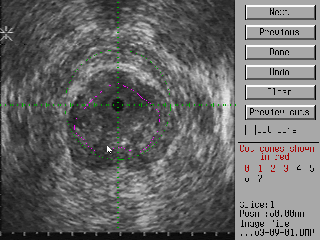 Having scanned the prostate, the surgeon can mark on each image the region he wishes to remove. The cutting volume is then presented to him as a three dimensional model that he can manipulate to optimise the cutting volume and time. The image below shows the screen the surgeon uses to outline the cutting volume overlaid onto each slice of the ultrasound image. Drawing the outline is simply a matter of sketching it onto the ultrasound image with the light pen.
