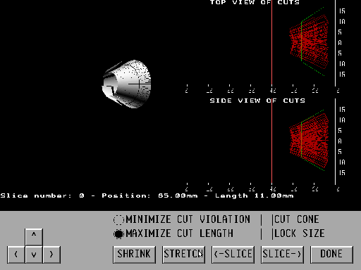 The display below is used by the surgeon to adjust the cutting cones. The computer starts by making each cone as long as possible, however the surgeon can fine-tune the cutting program by adjusting the cone lengths and turning on or off specific cones (the initial geometry specified by the surgeon may be such that some cones the computer generates more-or-less completely overlap other cones. A case in point is shown below. To save cutting time, the surgeon can shorten the right hand cone (marked green). Click here or on the image for a larger version.