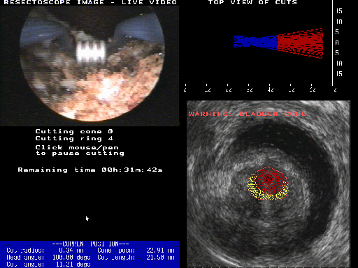 Finally, the robot is set to cut the prostate. Starting at the bladder neck and working backwards towards the verumontanum, each cone is cut as a sequence of concentric rings. When a cone is complete the robot retracts a little and cuts the next one. During the cutting procedure information is presented to the surgeon in three forms: