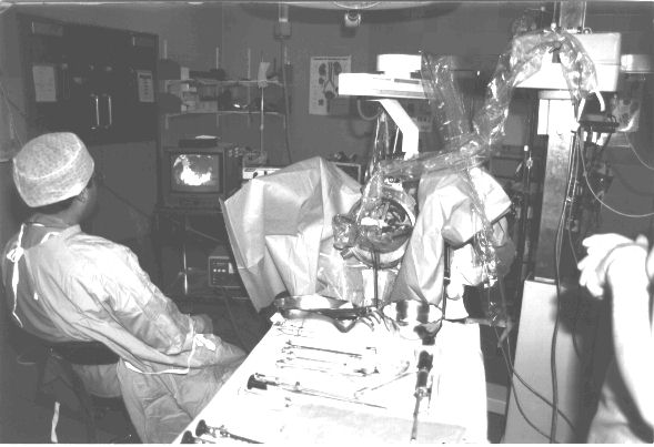 The Probot in the operating theatre. The surgeon is sitting to the left with his hands completely free of the patient and robot [Photograph: Q.Mei].