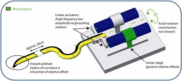 A biomimetic flexible steerable probe is currently being developed at Imperial College London: the aim is the access of deep brain areas with minimum damage in order to accurately place minimally invasive instrumentation (catheters, electrodes for deep brain stimulation), to perform clinical analysis and diagnosis (biopsy, sampling), localized drug delivery and micro neurosurgery.