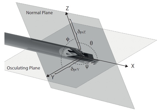 In the 3D kinematic model, a similar assumption as in the 2D Model, has been made for both the osculating and normal planes (see Figure), with the assumption that the ”effective steering offset” in 3D, which is a definition we use to describe how the different relative offsets between segments work together to produce a single overall tip orientation, is a function of all 4 parts of the needle.