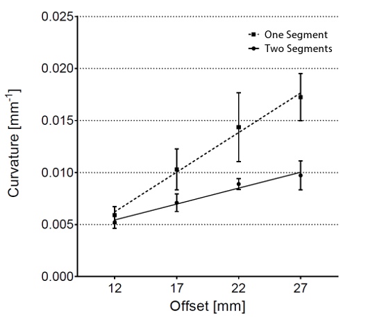 We have shown, previously [3], the concept of the ‘Programmable bevel’ where the steering angle of the needle, related to the curvature of the path taken, is a function of the offset between segments in 2D (Offset-Curvature relationship). We showed that this relationship is approximately linear between a bounded set of offsets. In the kinematic models above this is represented by setting κ to a constant.