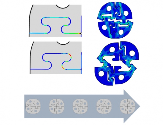 Clockwise from top left: Contact forces in different steering configurations; Extraction simulations testing interlock strength; Cross sections optimised for sliding performance.