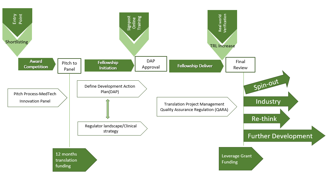 - MedTech Fellowships – up to £90k for 9-12 months, led by an early career researcher (ECRs) with the support of a PI. The applicant must pitch to a MedTech innovation panel (industry and clinical experts) as part of the selection process.