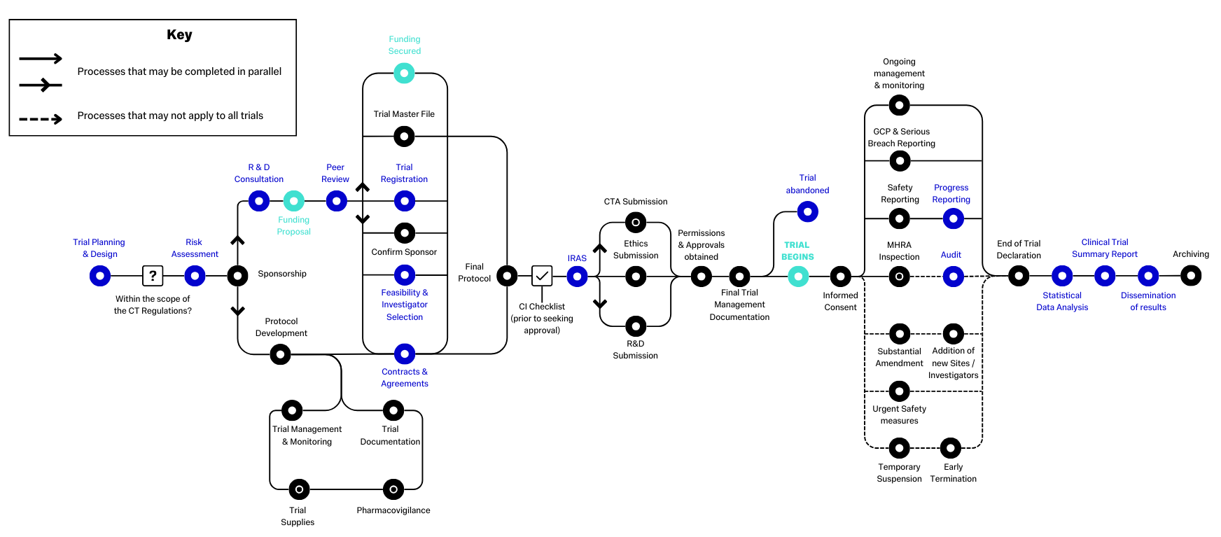 This diagram demonstrates the standard pathway that clinical trials follow. Items in black and green are standard items that will follow a set process, whereas items in blue may not apply to all studies, or may follow study specific processes. An example of this is "Contracts & Agreements" - The types of contracts, or other agreements, you need will vary depending on the nature of the project.