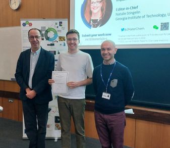 Congratulations to Charlie who was awarded the Journal of Materials Chemistry C poster prize at the CPE Annual Symposium. His poster was on his recent work on "Light-Soaking in Large Area Perovskite Solar Cells Driven by the Formation of Fullerene/BCP Charge Transfer Complexes."