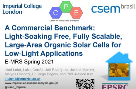 Joel presented his late stage review on his work on Fully scalable inverted organic solar cells for low-light applications and the role of light-soaking at the Plastic Electronics CDT Symposium.