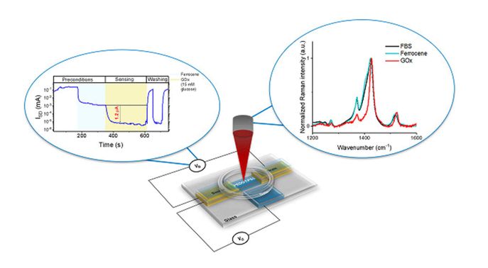 We demonstrate the use of in-situ resonance Raman spectroscopy to probe subtle molecular structural changes of PEDOT:PSS associated with its doping level. We demonstrate how such doping level changes of PEDOT:PSS can be used, for the first time, on operational organic electrochemical transistors (OECTs) for sensitive and selective metabolite sensing whilst simultaneously performing amperometric detection of the analyte. By changing the electrolyte to cell culture media, the selectivity of in-situ resonance Raman spectroscopy is emphasized as it remains unaffected by other electroactive components in the electrolyte. The application of this molecular structural probe highlights the importance of developing biosensing probes that benefit from high sensitivity of the material’s structural and electrical properties whilst being complimentary with the electronic methods of detection.