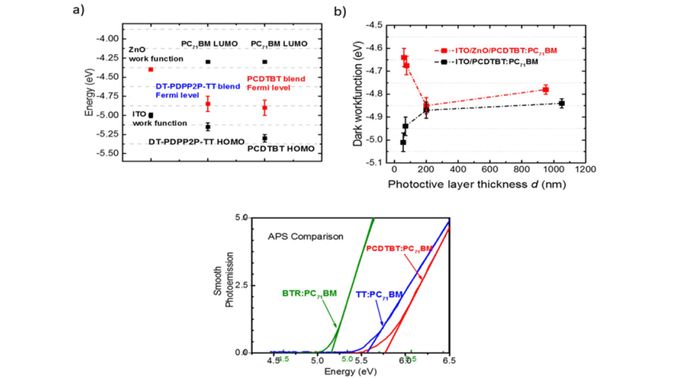 We measure the energetics of organic and perovskite semiconductor materials and at their interfaces, by Ambient Photoelectron Spectroscopy (APS) and Kelvin probe. Some examples are shown below; Figure (a) dark work-function and LUMO/HOMO values of 1µm thick organic bulk heterojunction films, (b) thickness dependent Fermi-level with different contact layers, in which a large change in the work function is found below 200 nm, but almost consistent over 200nm, and (c) Tail states in different organic bulk heterojunction martials.